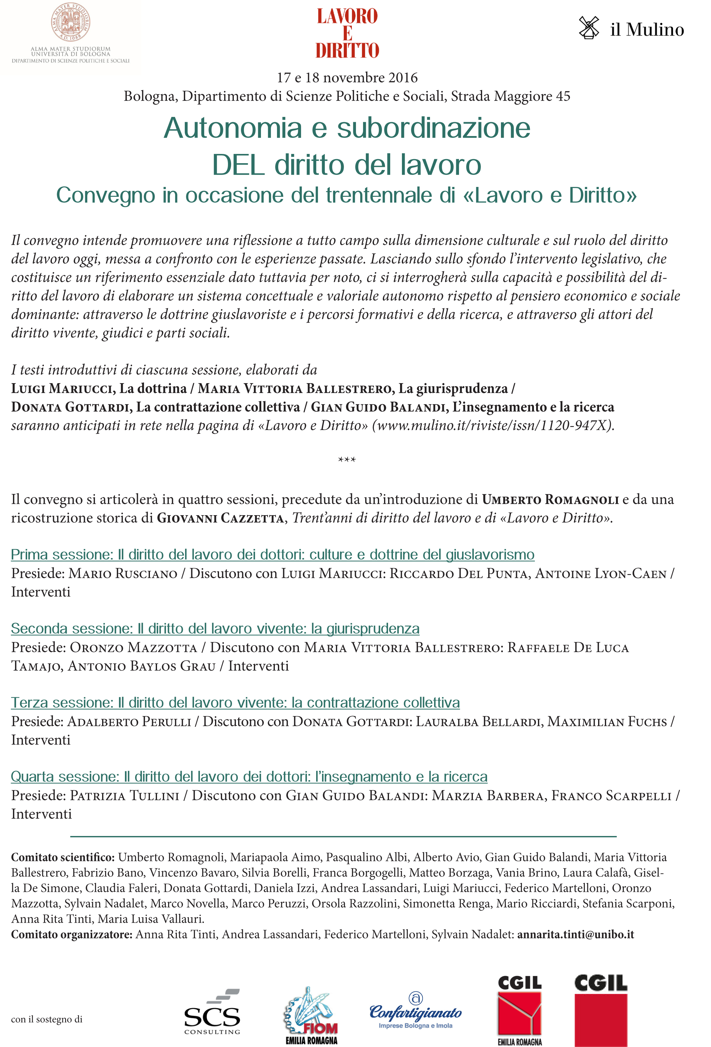 Autonomia e subordinazione del diritto del lavoro. Bologna, 17 e 18 novembre 2016