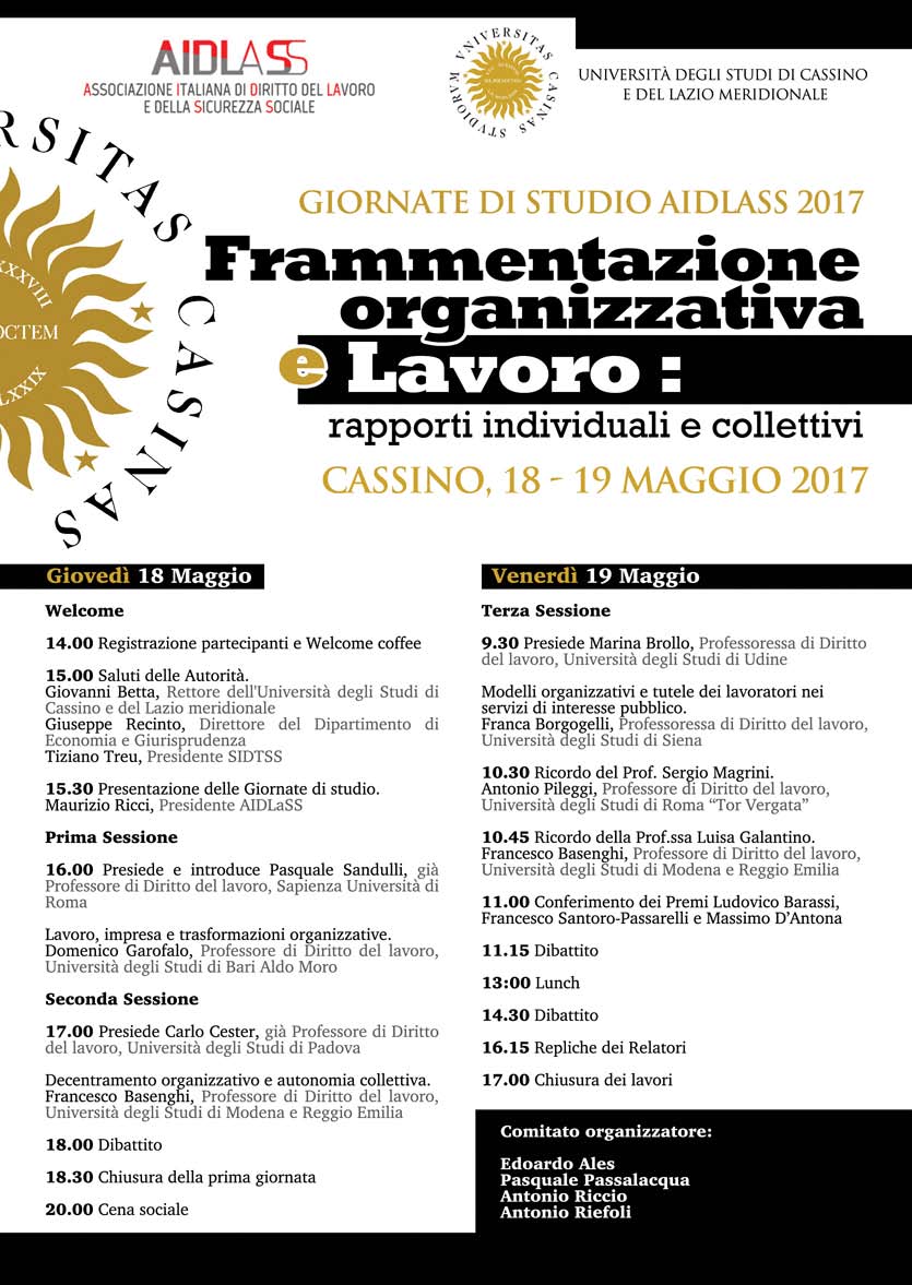 Frammentazione organizzativa e lavoro: rapporti individuali e collettivi. Cassino, 18 e 19 maggio 2017