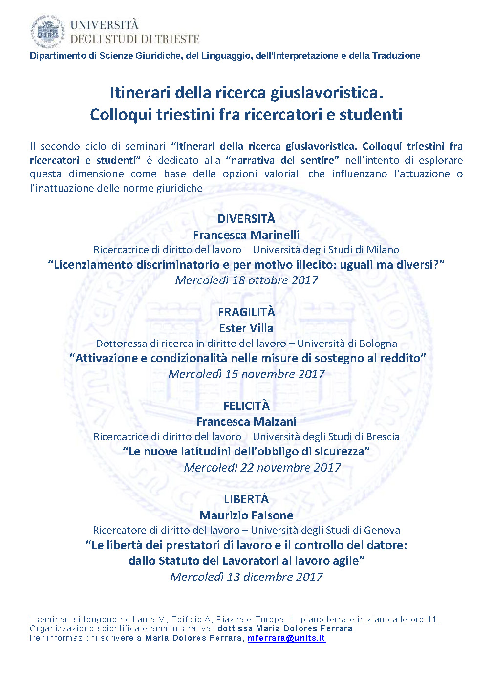 Itinerari della ricerca gisulavoristica. Colloqui triestini fra ricercatori e studenti. Trieste. 18 ottobre, 15 novembre, 22 novembre, 13 dicembre 2017