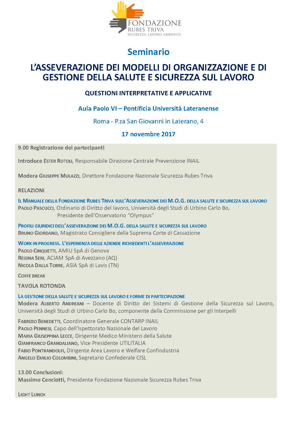 L’asseverazione dei modelli di organizzazione e di gestione della salute e sicurezza sul lavoro. Roma, 17 novembre 2017