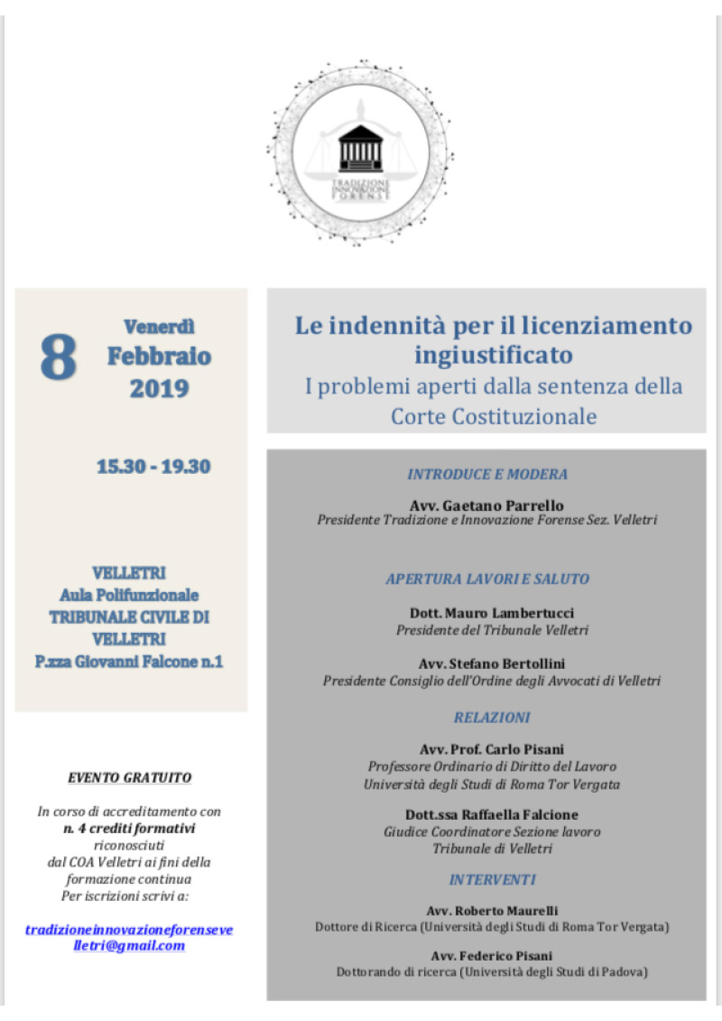 Le indennità per il licenziamento ingiustificato, Velletri 8 febbraio 2019