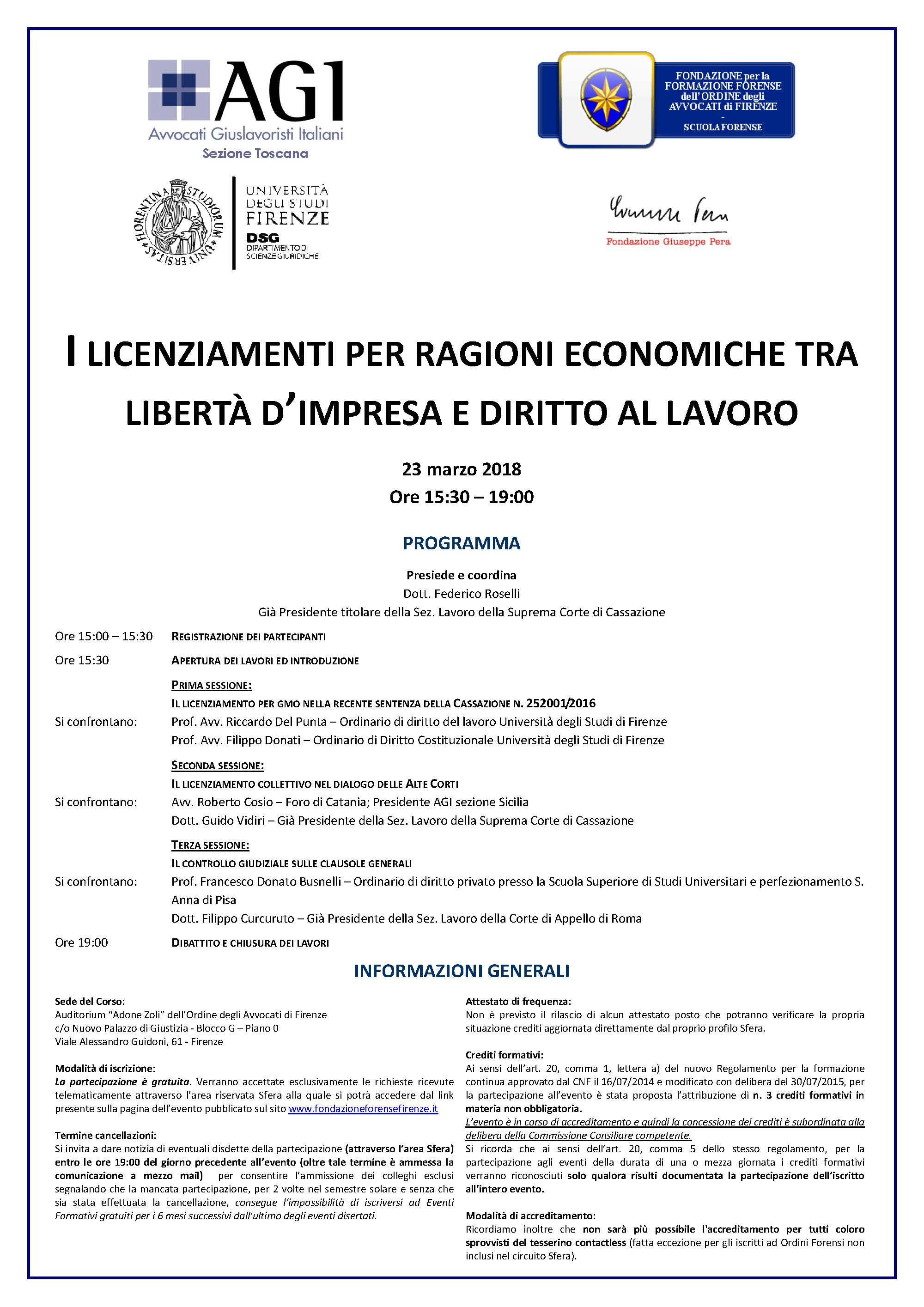 I licenziamenti per ragioni economiche tra libertà d’impresa e diritto al lavoro. Firenze, 23 marzo 2018